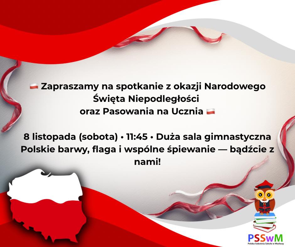 Serdecznie zapraszamy na wyjątkowy apel z okazji Narodowego Święta Niepodległości oraz uroczystości Pasowania na Ucznia, która odbędzie się 8 listopada (sobota) o godzinie 11:45 w dużej sali gimnastycznej naszej szkoły.